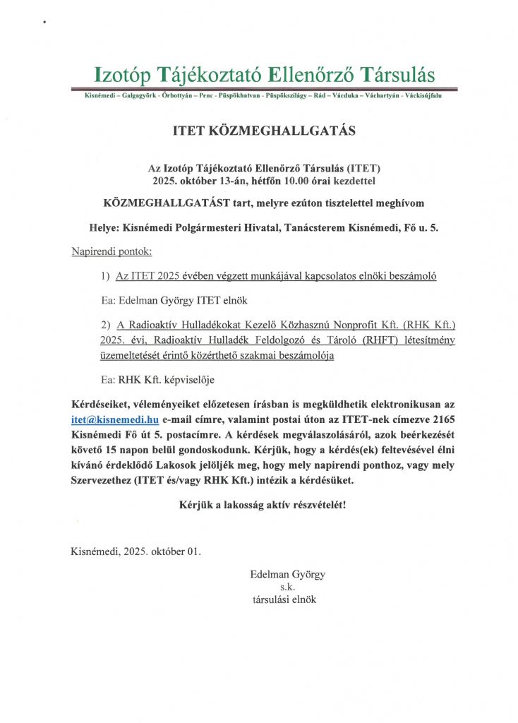 Az Izotóp Tájékoztató Ellenőrző Társulás 2025. október 13-án (hétfő) 10.00 órai kezdettel közmeghallgatást tart,  melyre tisztelettel várják az érdeklődőket. Az ülés helye: Kisnémedi Polgármesteri Hivatal, Tanácsterem (Kisnémedi, Fő u. 5.)