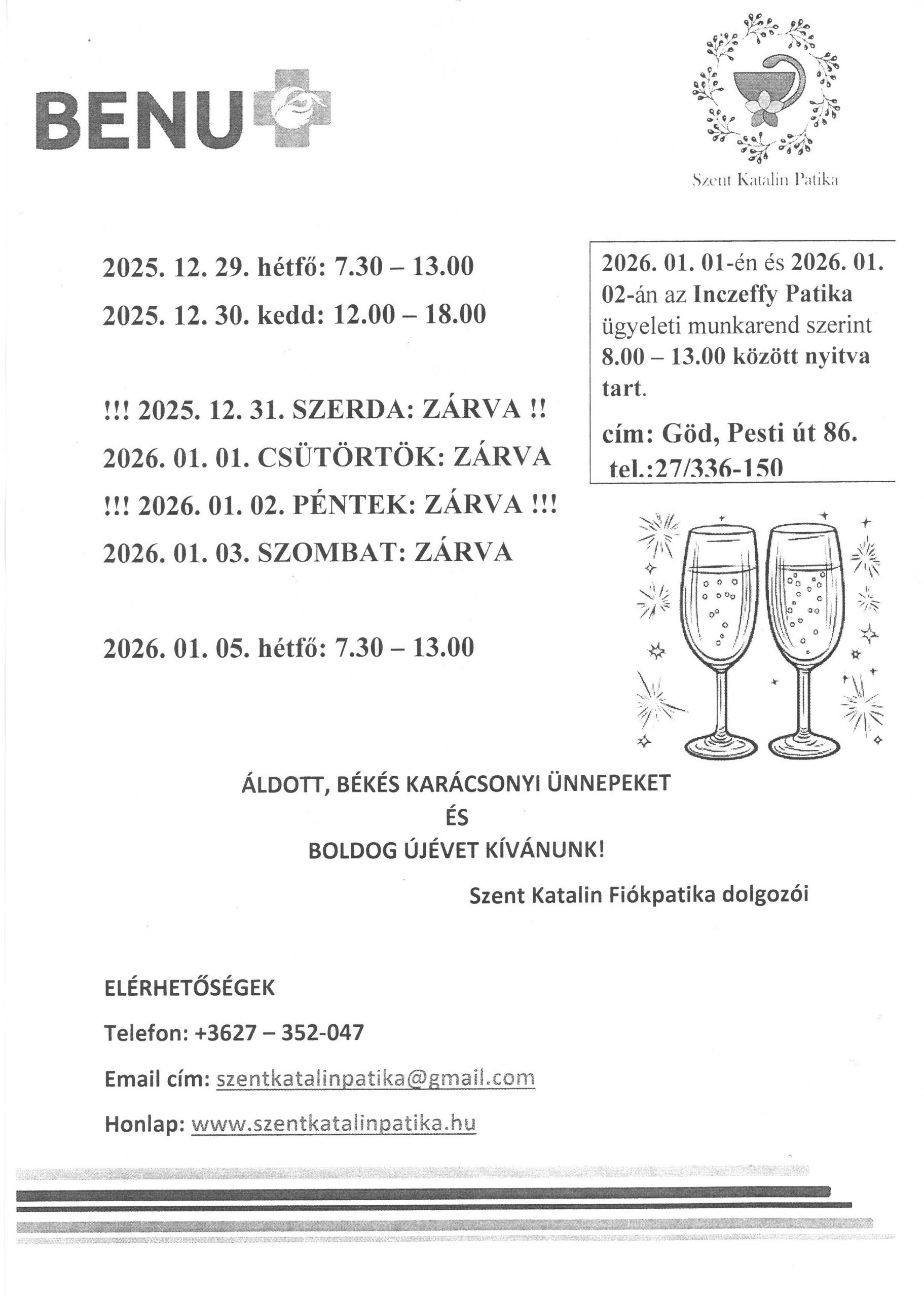 A Szent Katalin Fiókpatika ünnepi nyitvatartása a mellékelt dokumentumban olvasható.