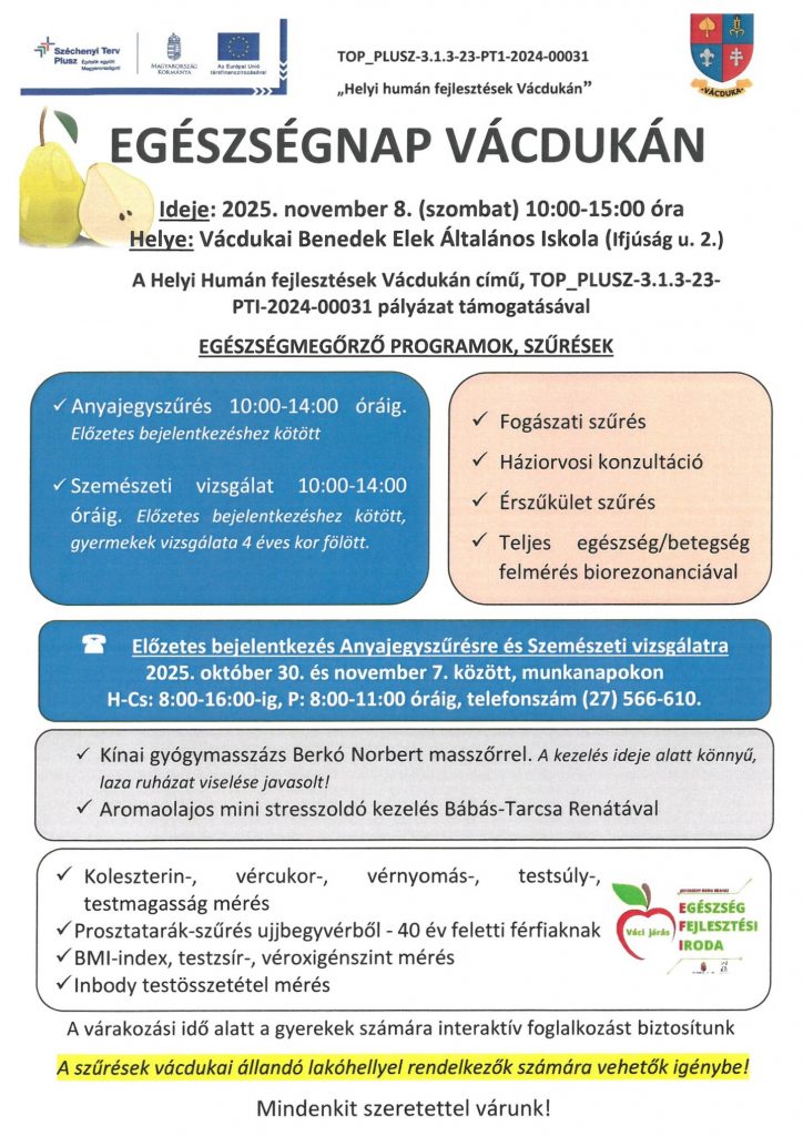 Az Egészségnap időpontja: 2025. november 08. (szombat) 10.00 – 15.00 óra között
