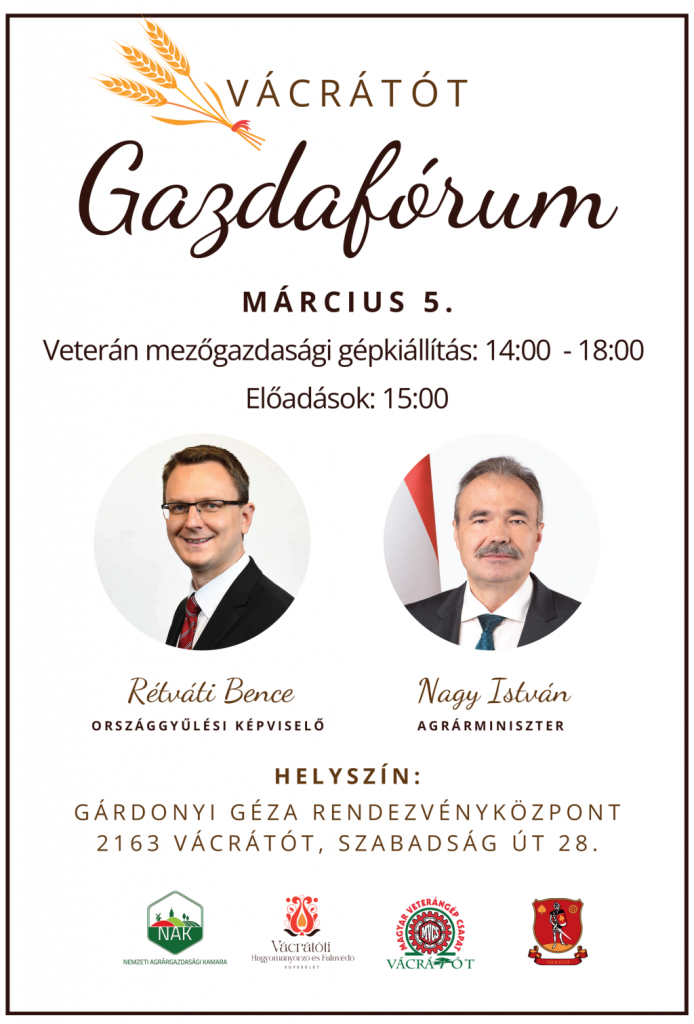 2026. március 5-én, csütörtökön 15 órától a Vácrátóti Gárdonyi Géza Rendezvényközpontban (2163 Vácrátót, Szabadság út 28.) Vácrátóti Gazdafórum. Vendég: Nagy István agrárminiszterTovábbi részlet a melléket plakáton olvasható: