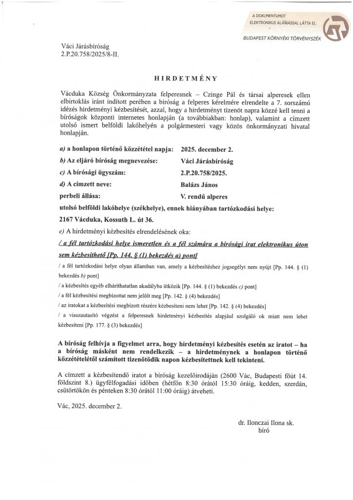 Vácduka Község Önkormányzata felperesnek – Czinge Pál és társai alperesek ellen elbirtoklás iránt indított perében a bíróság a felperes kérelmére elrendelte a 7. sorszámú idézés hirdetményi kézbesítését, azzal, hogy a hirdetményt tizenöt napra közzé kell tenni a bíróságok központi internetes honlapján (a továbbiakban: honlap), valamint a címzett