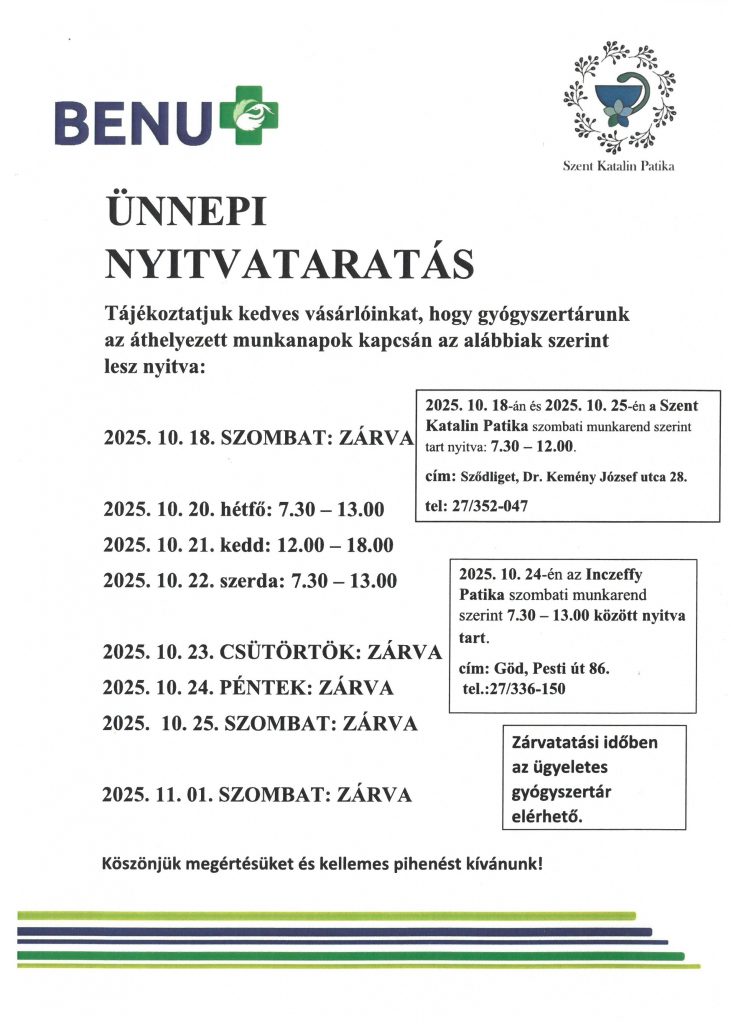 Szent Katalin Fiókgyógyszertár ünnepi nyitvatartása