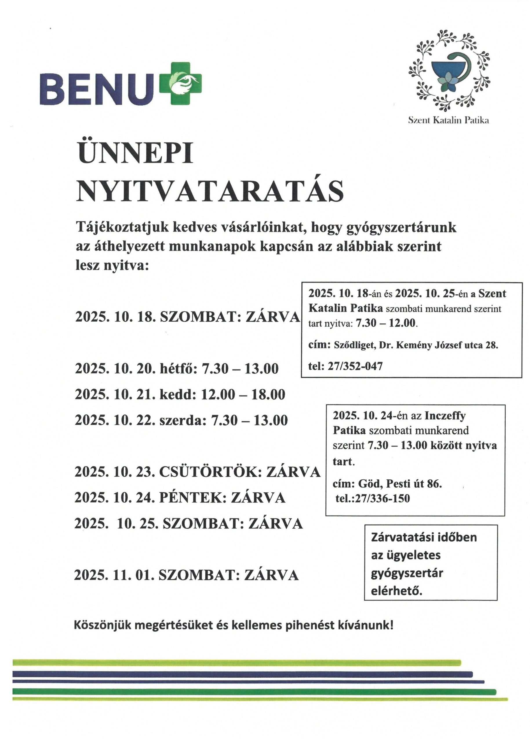 A Szent Katalin Fiókpatika ünnepi nyitvatartása a mellékelt dokumentumban olvasható.