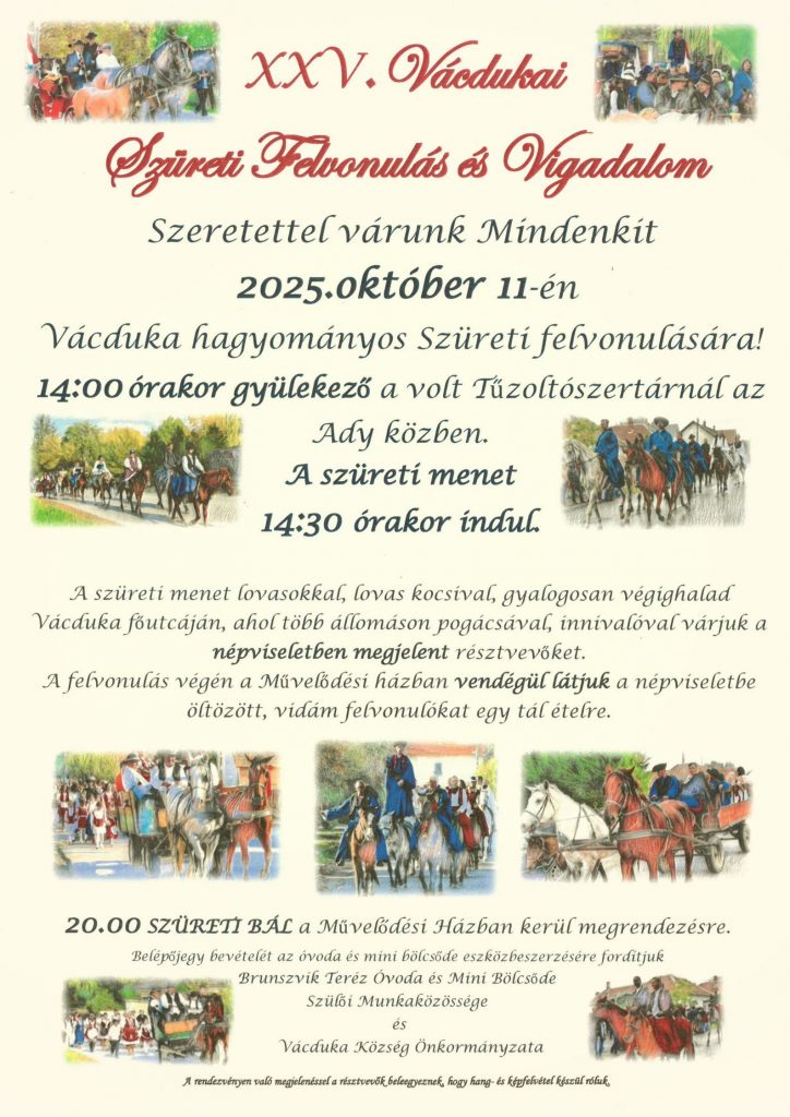 Szeretettel meghívjuk Önt és kedves családját az október 11-én (szombaton) Vácdukán megrendezésre kerülő Szüreti Felvonulásra és az azt követő Bálra.