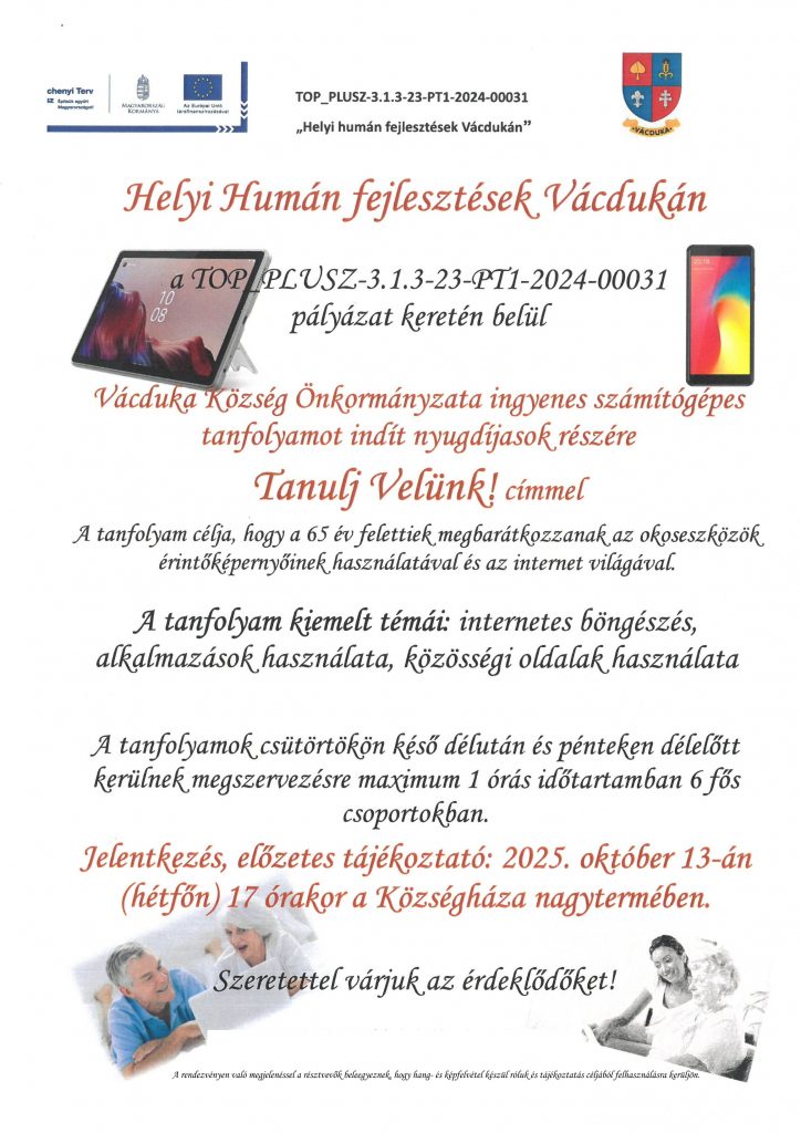 Vácduka Község Önkormányzata ingyenes számítógépes tanfolyamot indít nyugdíjasok részére Tanulj Velünk! címmel